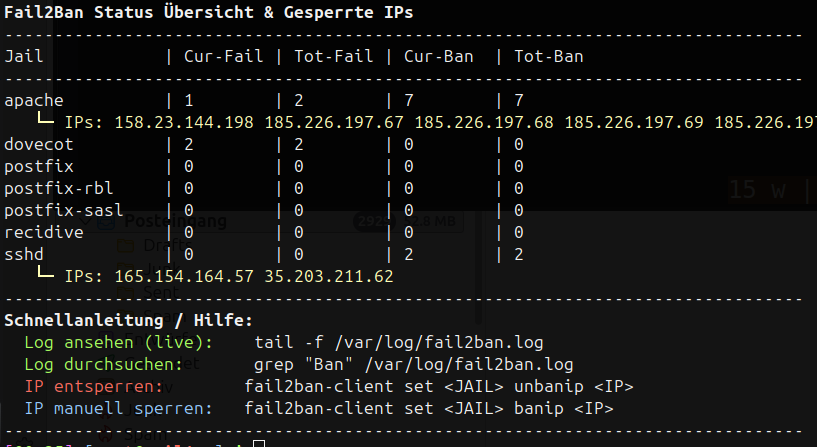 echo -e " \033[31mIP entsperren:\033[0m fail2ban-client set <JAIL> unbanip <IP>"