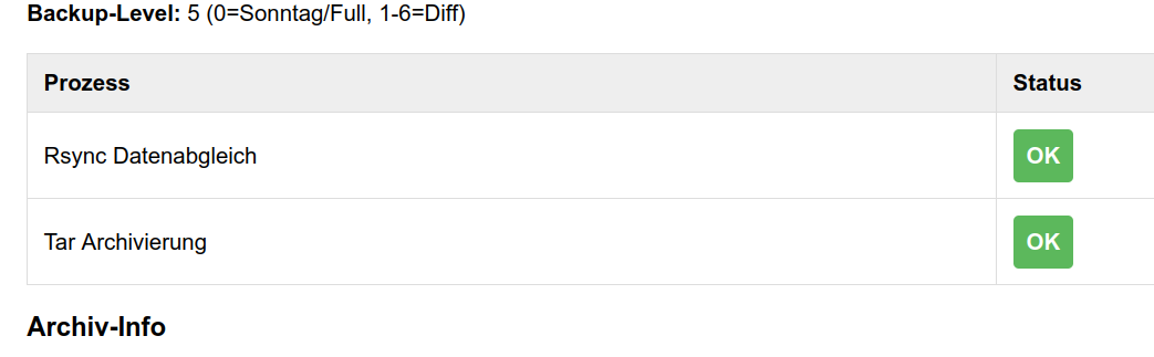 | Archivierung | tar | Erstellt komprimierte Abbilder (.tgz). Sonntags ein Full-Backup (Level 0), an Wochentagen nur die Änderungen (Differenziell). |