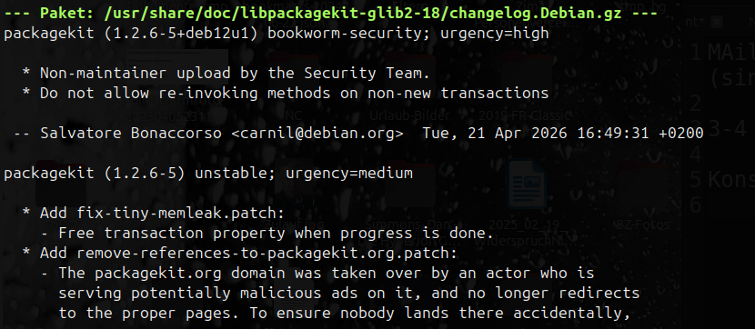 Jedes installierte Paket speichert seine Historie unter /usr/share/doc/. Wenn man wissen will, ob ein Paket wie packagekit bereits gefixt ist: